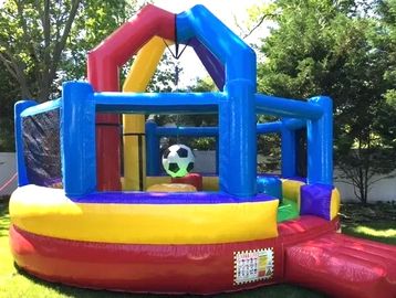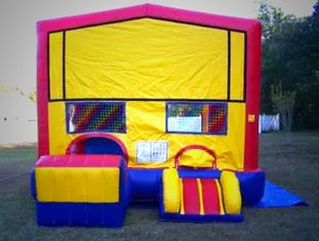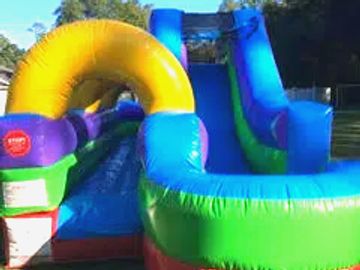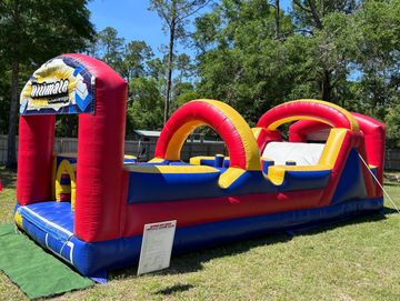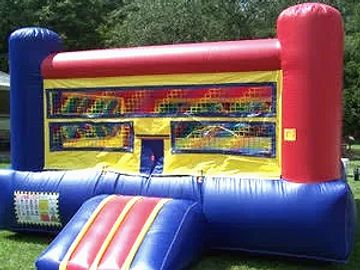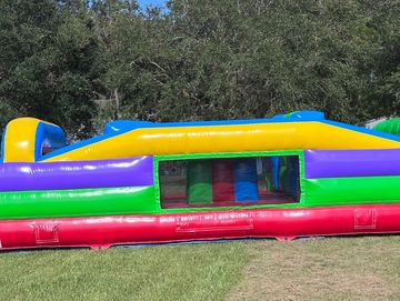 Packed with action! This inflatable features a variety of obstacles, a rock wall to climb, a slide, a basketball hoop, and a spacious bouncing area.
